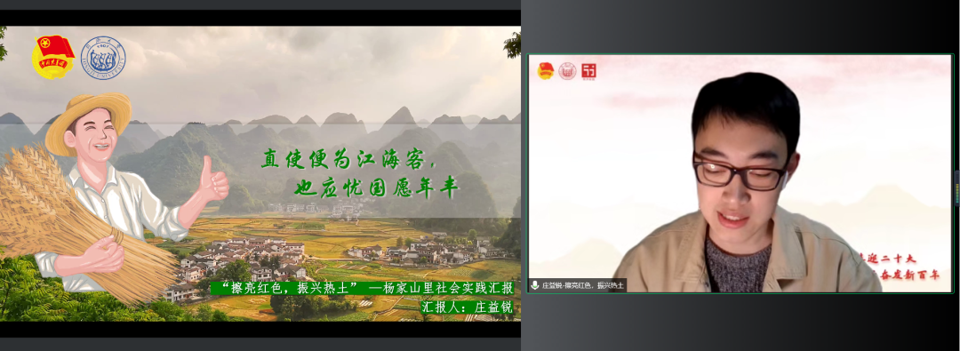 “擦亮红色,振兴热土”项目团队代表庄益锐同学表示,为了服务国家乡村振兴战略,“擦亮红色,振兴热土”实践队来到杨家山里开展社会实践,在红色基地重温入党誓词,在村里田间同村民深入交谈,在田园综合体读懂绿水青山。实践队整理口述史报告,为当地提供发展建议书,并通过新闻报道、推送、直播等方式宣传杨家山里的发展情况,为杨家山里提了建议、聚了人气,充分展现出同济青年在乡村振兴中的使命担当。