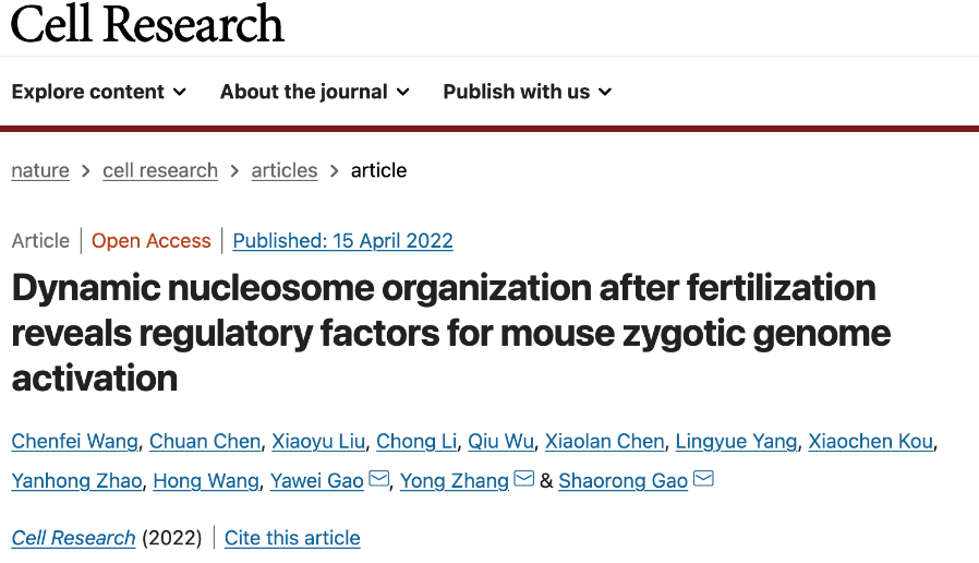 4月15日,生命科学与技术学院教授高绍荣和张勇课题组合作,在《细胞研究》(Cell Research)杂志在线发表题为“受精后核小体的动态组织揭示小鼠合子基因组激活的调节因素(Dynamic nucleosome organization after fertilization reveals regulatory factors for mouse zygotic genome activation)”的文章。首次从染色质上核小体位置的角度揭示了小鼠受精后12小时内父母染色质重新组建的动态过程和调控机制,强调了以组蛋白为基础的染色质状态调控对于正常发育过程的重要意义,揭示了生命初始阶段的调控秘密。