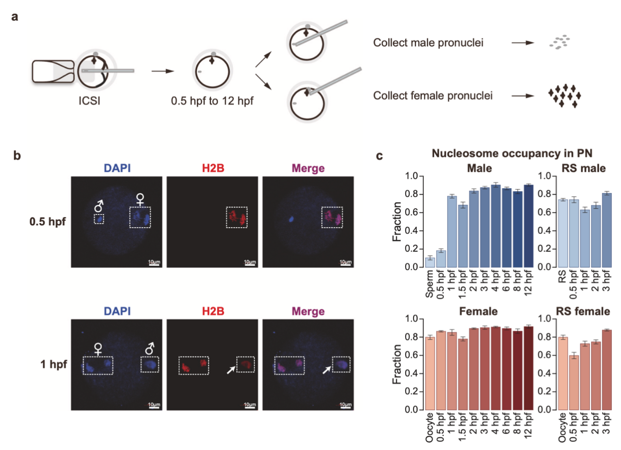 研究团队研发出一种在低起始量(甚至单细胞)上检测基因组核小体排布的新技术(ULI-MNase-seq,已获批专利),并开发出一套专门针对核小体数据的分析流程NEPTUNE。高绍荣介绍,利用显微操作,我们将受精后0.5小时至12小时9个连续时间点的雌雄原核进行手动分离,并对这些原核与配子细胞进行核小体排布检测,从而首次完成了受精前12小时核小体动态重塑的精细描绘,并发现了父源基因组在受精后1小时左右就能够完成鱼精蛋白到组蛋白的替换,而雄原核上转录活性相关的核小体缺失区域(Nucleosome depleted region,NDR)建立也更迅速。