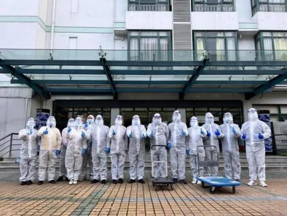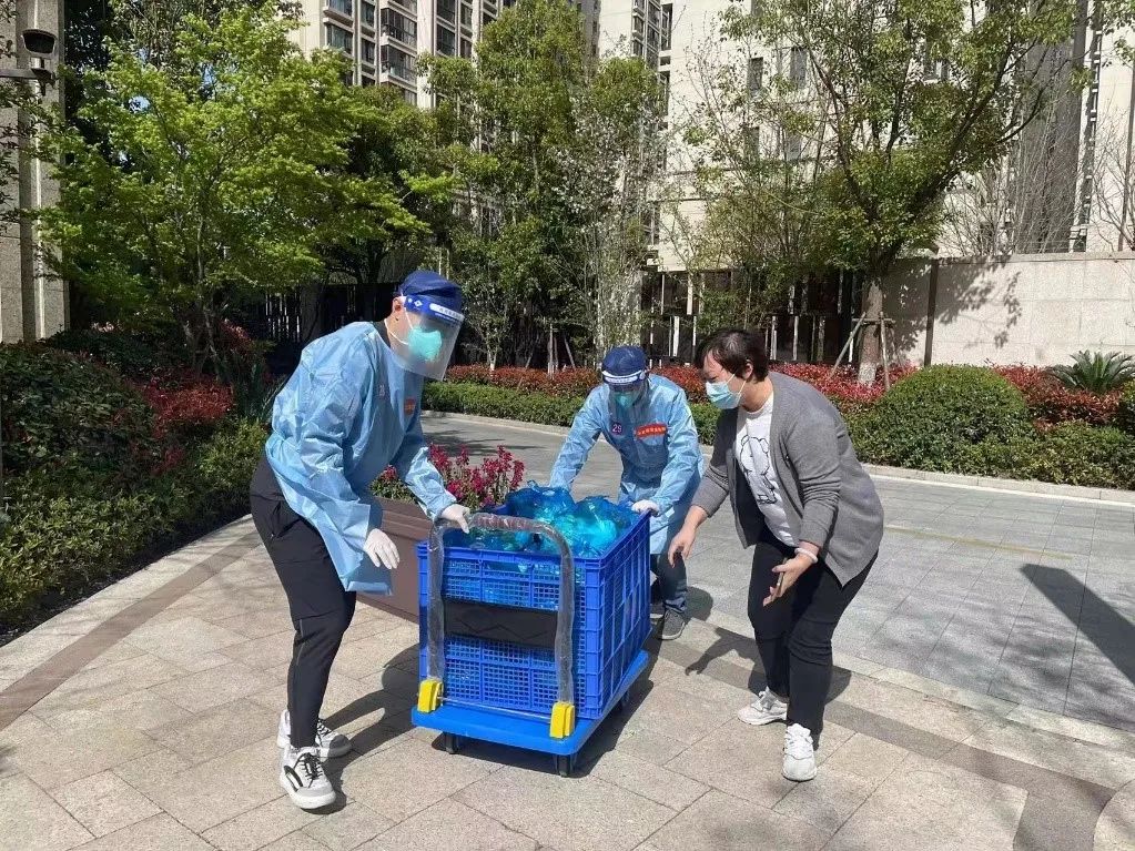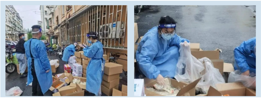 在学校实施楼宇封控管理后,驻守学院的老师组成送餐志愿服务队,无论烈日当空或是大雨倾盆都及时为学生配送一日三餐、水果、饮用水及防疫物资。