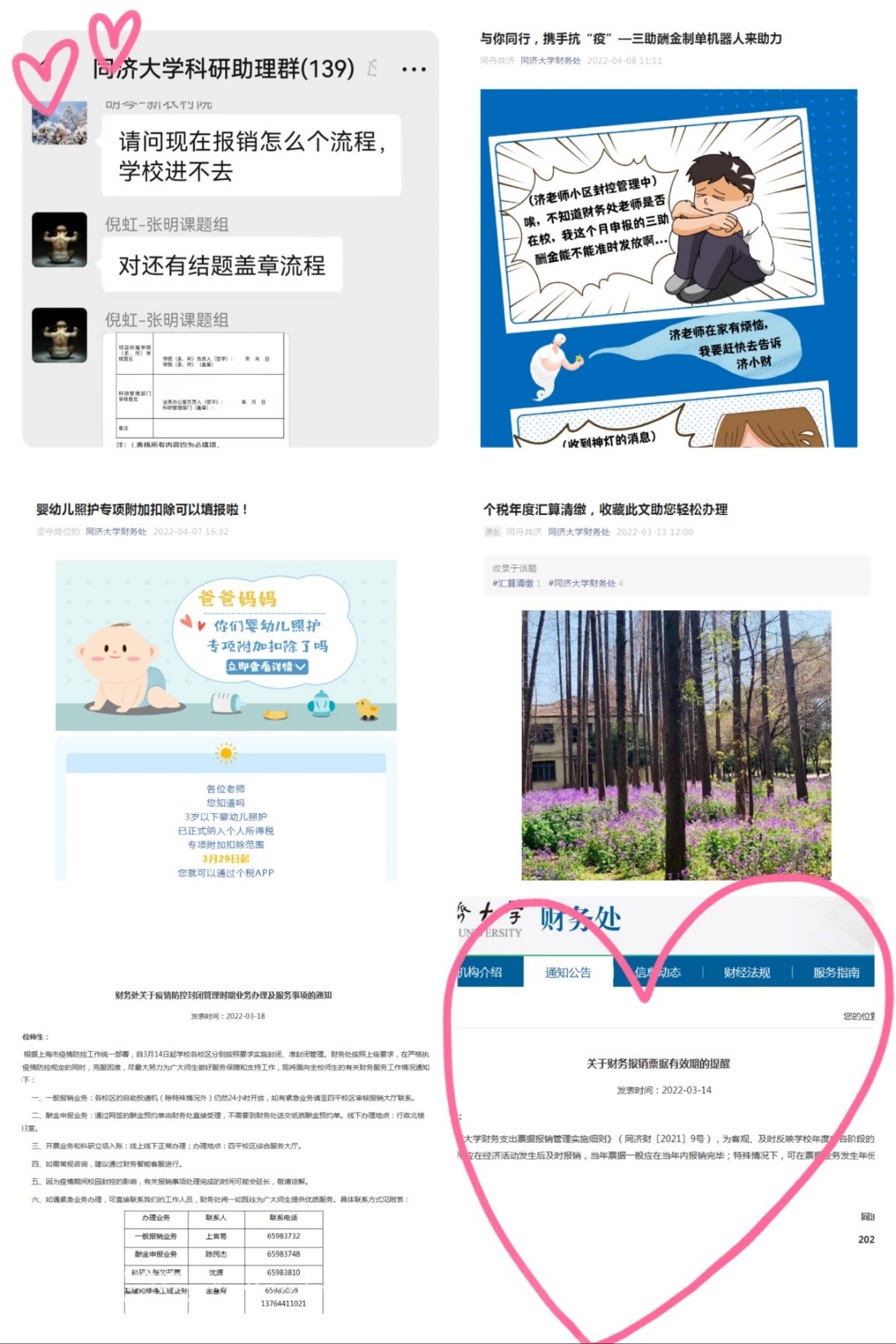 4月7日,发布“婴幼儿照护专项附加扣除可以填报啦!” (https://mp.weixin.qq.com/s/13jHRtFRet3caZPB7ZMnag),4月8日,发布“与你同行,携手抗‘疫’—三助酬金制单机器人来助力”(https://mp.weixin.qq.com/s/4ExhOcYCH2DrF_qJCPhnIw),及时将财务新举措告知全校师生,在疫情期间确保工作稳定、持续、有序开展。
