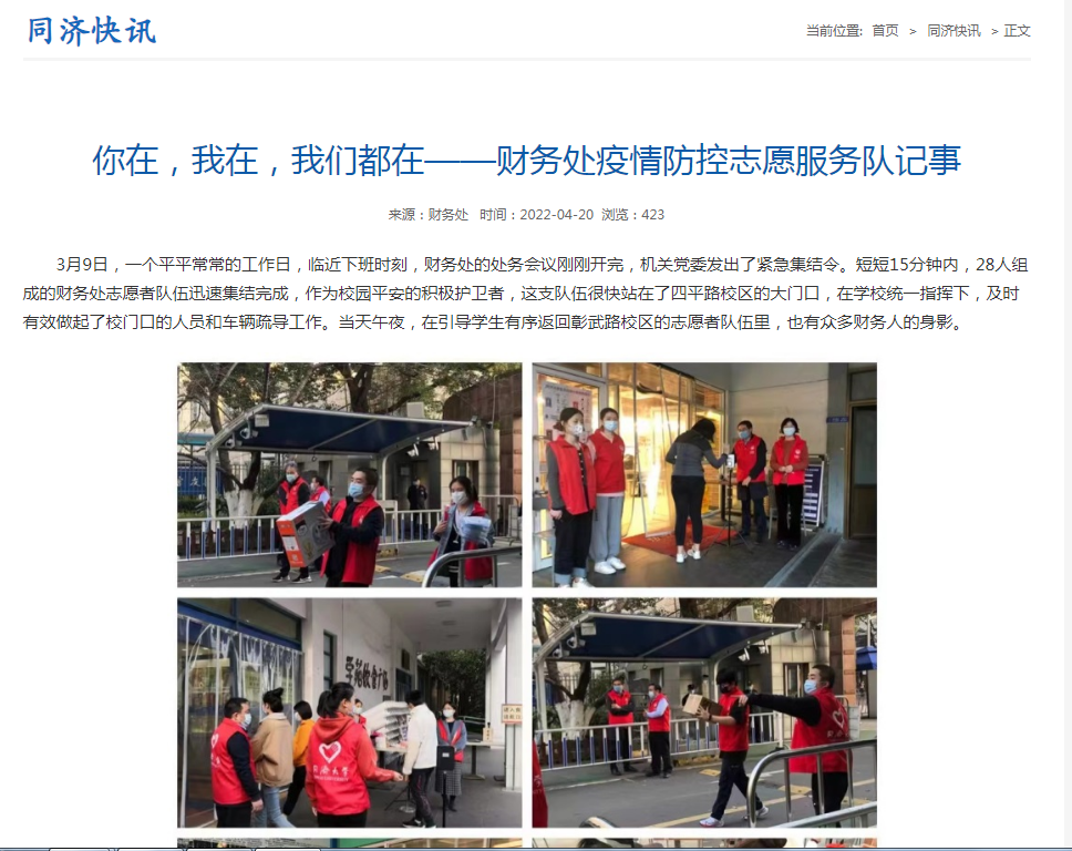 2022年4月20日,同济大学新闻网以“你在,我在,我们都在——财务处疫情防控志愿服务队记事”专题报道了财务处志愿服务事迹。//www.yasgen.com/info/1003/80710.htm