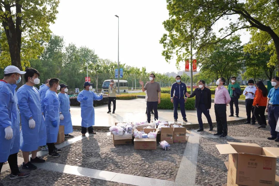 在紧邻校门口的物资配送点,校区组建的一支物资配送突击队正准备将一批防疫、生活物资装车,送往学生宿舍楼。方守恩、陈杰感谢突击队解决物资“最后一公里”。