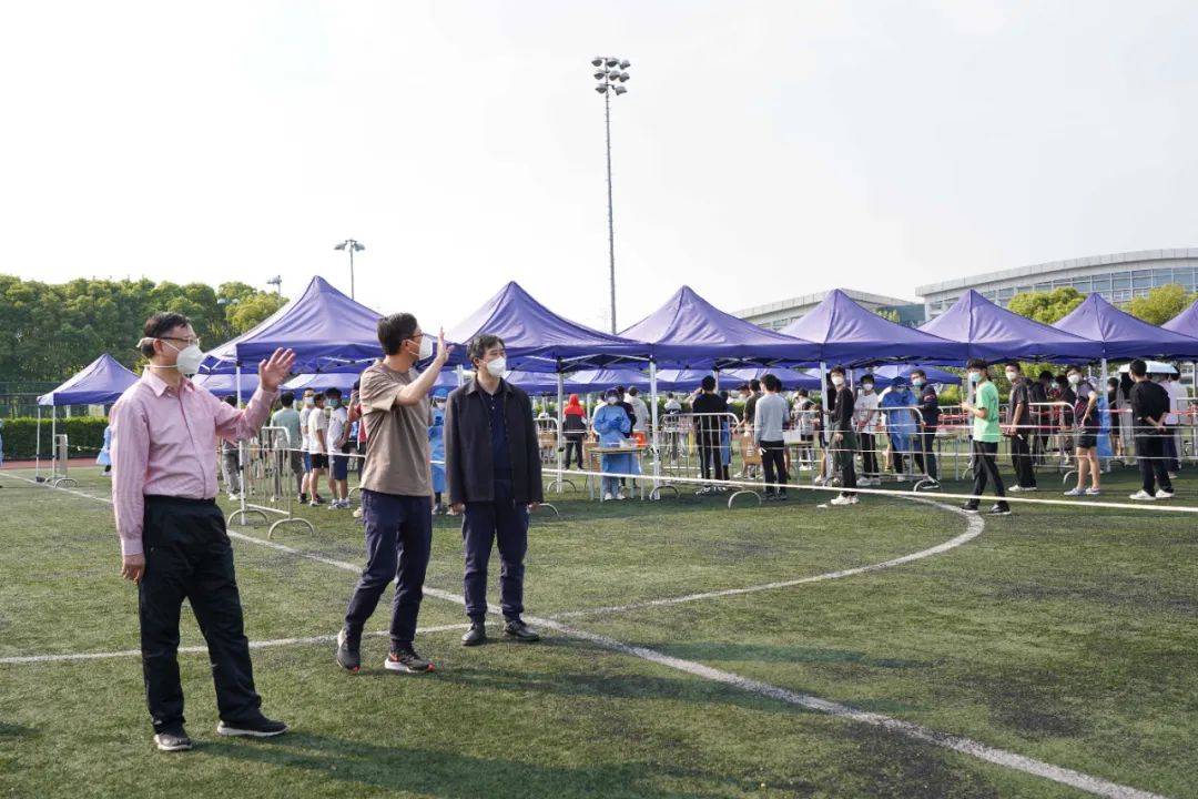 方守恩、陈杰首先来到设于人工草坪操场的核酸采样点。此时,学生正在有序排队接受核酸检测。方守恩、陈杰向同学们招手致意,向他们问好,对负责核酸采样的学校医务人员和现场志愿者同学们的辛勤付出表示感谢。