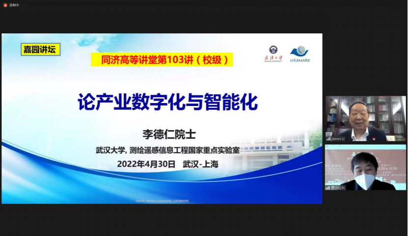 4月30日,武汉大学教授、中国科学院院士、中国工程院院士李德仁带来题为《论产业数字化与智能化》的讲座。讲座由副校长童小华主持。讲座中,李德仁教授围绕新基建的关键字眼:“新发展理念”“技术创新”“信息网络”“高质量发展”“数字转型、智能升级、融合创新”展开分享。