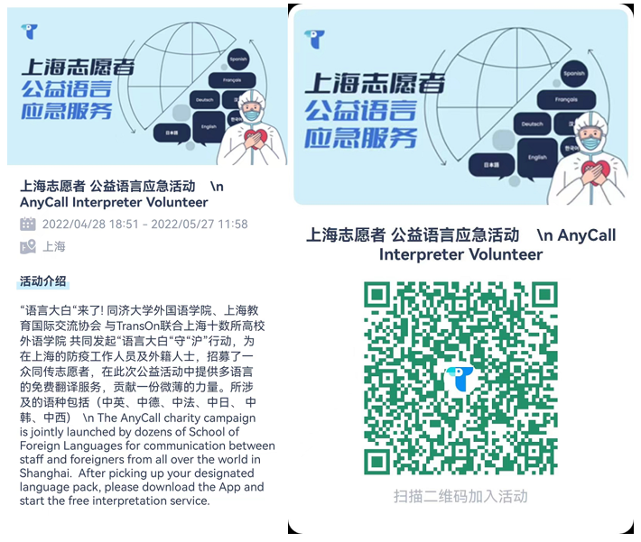 近日,一场主题为“语言大白守‘沪’行动”的外语志愿者公益服务在上海全市范围内正式启动。该公益服务由同济大学外国语学院、同济大学国家语言文字推广基地、云同传平台“Trans On”、上海教育国际交流协会牵头,联合上海17所高等院校的外国语学院和高级翻译学院共同发起,发动各语种外语专业人士在线注册成为志愿者,为在沪外籍人士和社区防疫工作人员提供无接触式的“云端”多语种即时应急翻译服务,帮助他们解决疫情特殊时期不同语言文化相互交流沟通中的语言难题,从而为打赢上海疫情防控攻坚战贡献力量。