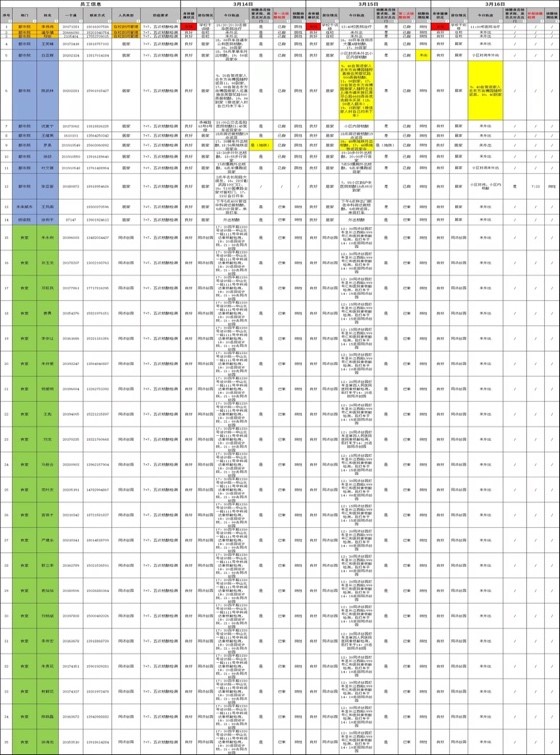 此轮疫情需在短时间内排摸掌握集团人员数据。设计院人数达4500余人,且办公场所分散、人员性质不同,人员构成极其复杂。在摸清人员底数的同时,集团对人员实施分类化精准管理,按优先级划分并管理不同人群,包括教职工、员工、实习生、协作单位人员、居住公司公寓员工等,并按人员流动情况实施动态更新。3月9日晚起至3月12日是学校人员底数摸清工作最重要的关键时间段,工作任务时间紧,工作人员不断跟部门确认、沟通,一对一核对,确保掌握每一位进校、留校人员的具体情况,做到“底数清、情况明”。及时排摸员工核酸检测情况,尤其为3月6日及以后进入四平路校区的61名员工,制定专人定时提醒做好5次核酸检测,并做好记录。