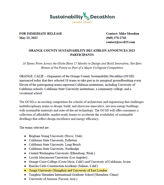 近日,同济大学与东伦敦大学联合赛队成功入选2023年奥兰治县可持续发展十项全能竞赛(OCSD23),双方将在美国加利福尼亚州共同建造一座可持续住宅。