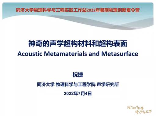 此次夏令营开营活动邀请到国家高层次人才、同济大学物理科学与工程学院祝捷教授作了题为《神奇的声学超构材料和超构表面》的科学讲座。祝捷教授从中国传统文化入手向同学们介绍了声学发展历史、声波基本原理以及超构材料和超构表面的研究发展,介绍了同济大学声学研究所取得的一系列科研成果,并与同学们在线进行了热烈的讨论和交流。
