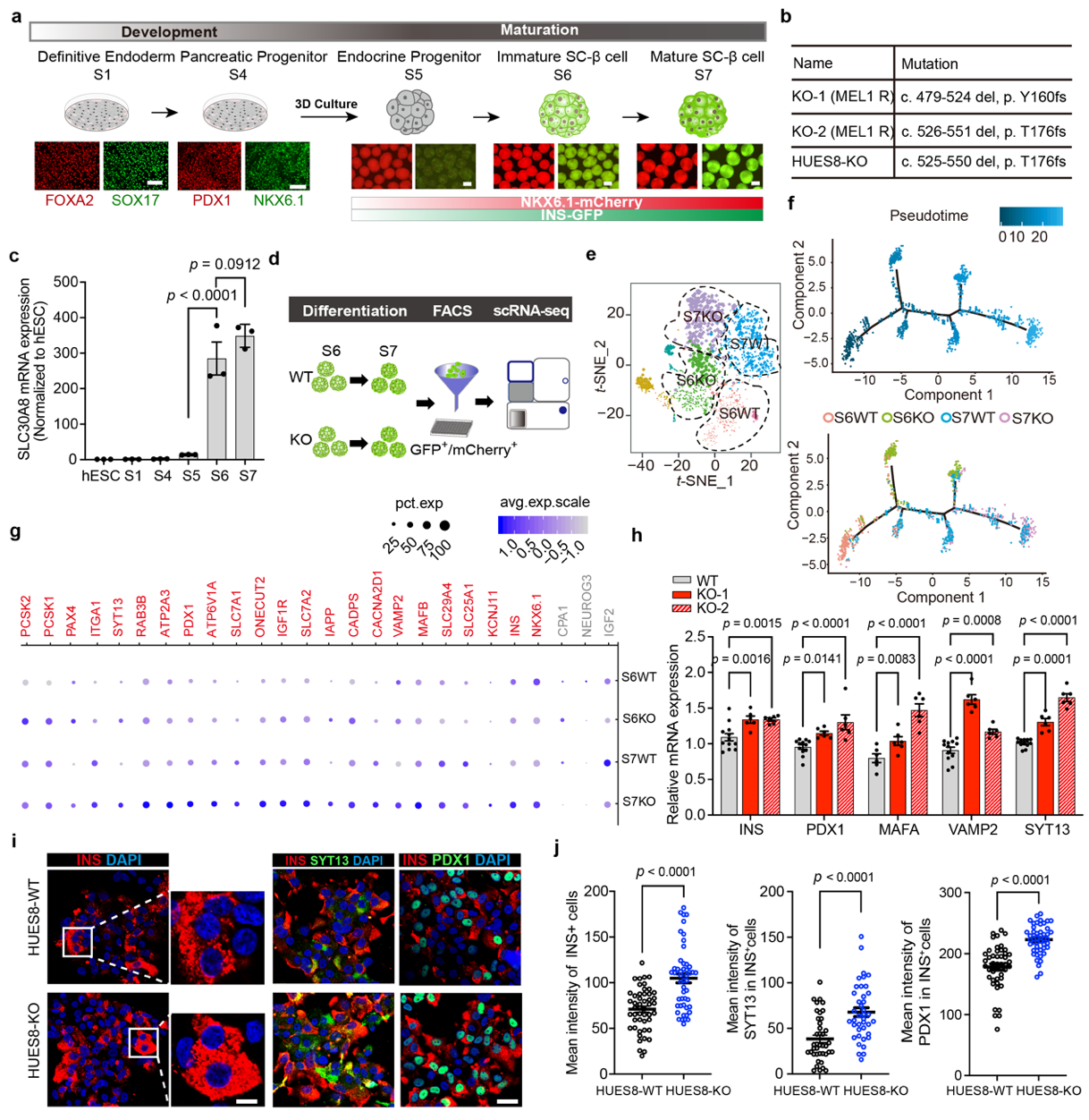 SLC30A8 基因编码的锌离子转运蛋白ZnT8是胰岛特异性的锌转运蛋白,高表达于β细胞分泌囊泡,负责将锌离子从细胞质转运进入胰岛素分泌囊泡当中。该研究发现,缺失ZnT8蛋白的SC-β细胞总是在较高浓度葡萄糖(20 mM)刺激下表现出旺盛的胰岛素分泌能力,这引起了他们的兴趣。进一步研究发现,ZnT8只表达于SC-β细胞分化发育的成熟期,即S6和S7阶段,这意味着ZnT8可能参与了β细胞功能发育成熟的调控。单细胞测序结果表明ZnT8敲除的SC-β细胞中与β功能相关的基因如INS、NKX6.1、PDX1、SYT13、VAMP2相较于对照组细胞均有显著上调,拟时序分析也表明在分化的最后两个阶段ZnT8缺失的SC-β细胞发育更加成熟。