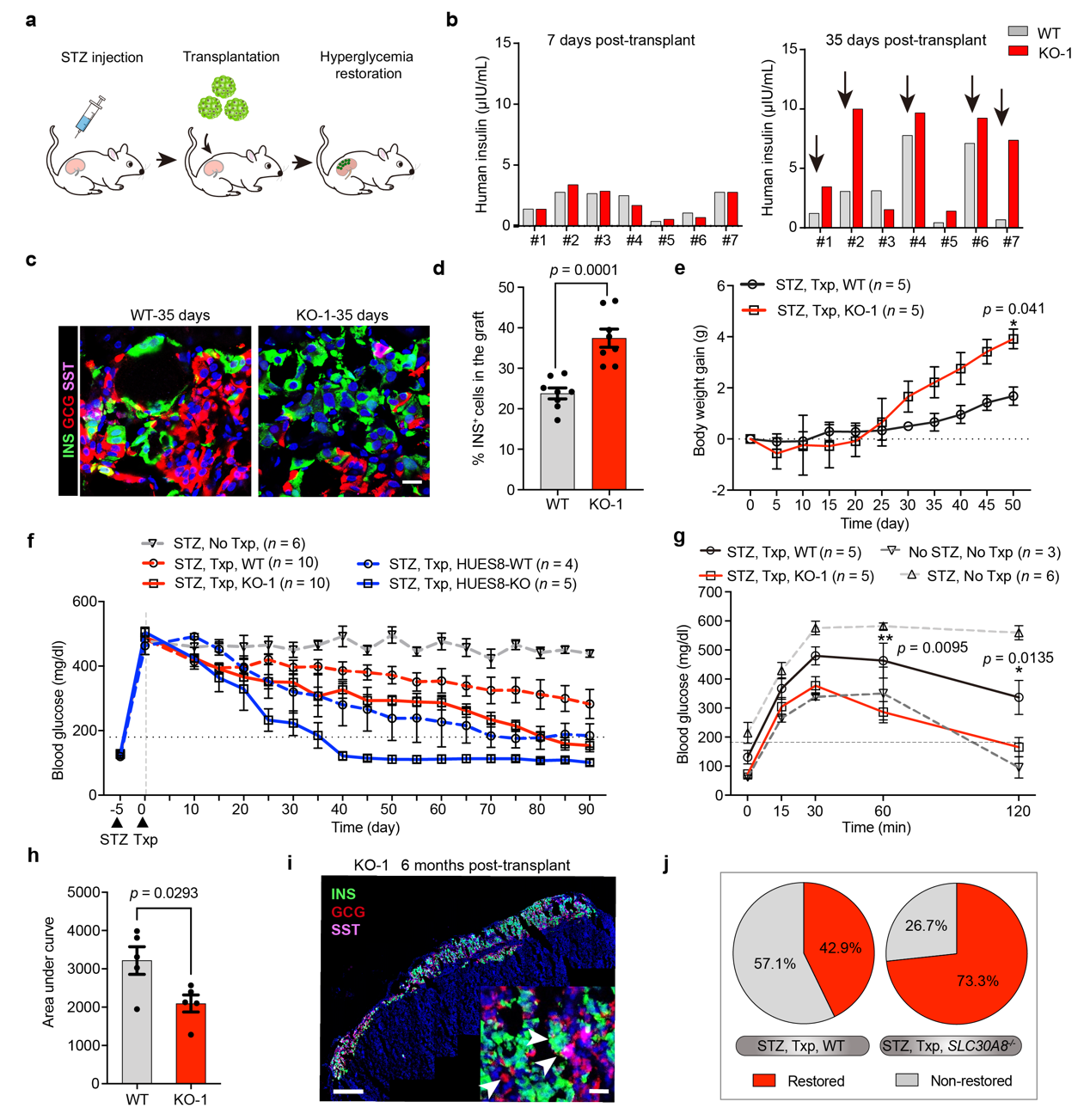 研究人员将ZnT8功能缺失的SC-β细胞及其对照组细胞分别移植入使用链脲霉素(Streptozotocin,STZ)建模的SCID-Beige免疫缺陷型小鼠肾包膜内,并在移植后持续监测小鼠血糖变化。研究人员发现,移植了ZnT8功能缺失的SC-β细胞的小鼠在移植一段时间后血糖下降更快,且下降的幅度更大。当血糖下降至180 mg/dL以下时,认为小鼠血糖恢复正常。通过计算治愈率可以发现,移植野生型SC-β细胞的小鼠糖尿病治愈率为42.9%,移植等剂量ZnT8功能缺失的SC-β细胞的小鼠糖尿病治愈率为73.3%,后者比前者治愈率高出了30.4%。经过基因编辑的SC-β细胞相较于未编辑的SC-β细胞可在小鼠体内更加稳定存活。
