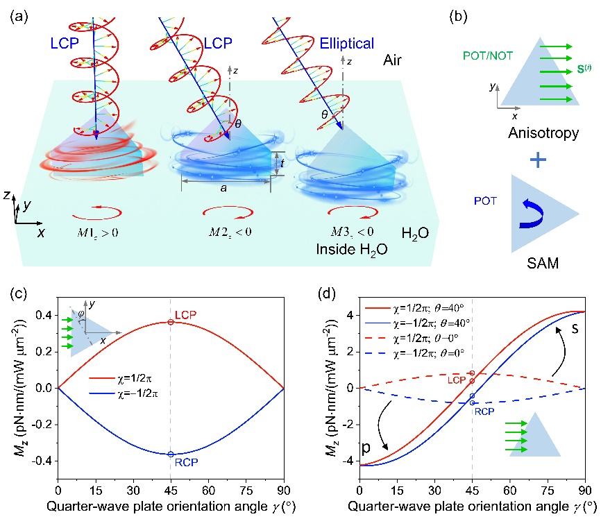 光镊技术利用光力对微小颗粒进行操控,而光的角动量产生的光力矩在其中同样起着至关重要的作用,因而受到了学者们的广泛关注。光力矩在包括量子光机械系统、摩擦学、生物分子的扭转测量、微小搅拌马达的构建在内的物理、生物医学、化学等领域应用广泛。通常情况下,颗粒在圆偏振光中由于自旋角动量的作用会产生方向与自旋角动量一致的光力矩。而“负光力矩”的方向与自旋角动量相反,近期被发现于金属手性颗粒、相位迟滞盘、颗粒簇等系统中。然而,受偶极子模型影响,尚未曾在单个非金属颗粒中发现“负光力矩”。该研究团队利用斜入射的椭圆偏振光,首次在介电质三棱柱中发现了“负光力矩”,揭示了不同偏振态在三棱柱结构中对力矩的作用机制,如图1所示。