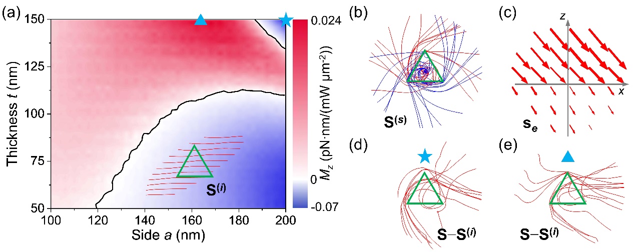 同时,该团队发现该“负光力矩”与光的椭偏度、颗粒的大小和折射率关系密切,如图2所示。尤其,当四分之一波片的偏转角越小,即光更趋向于p偏振,或颗粒的折射率越高,都越容易激发“负光力矩”。相反,颗粒的吸收则会产生“正光力矩”,进而削弱“负光力矩”的作用。而颗粒的尺寸,包括三角的边长和厚度都会对光力矩产生很大的影响,如图3所示。