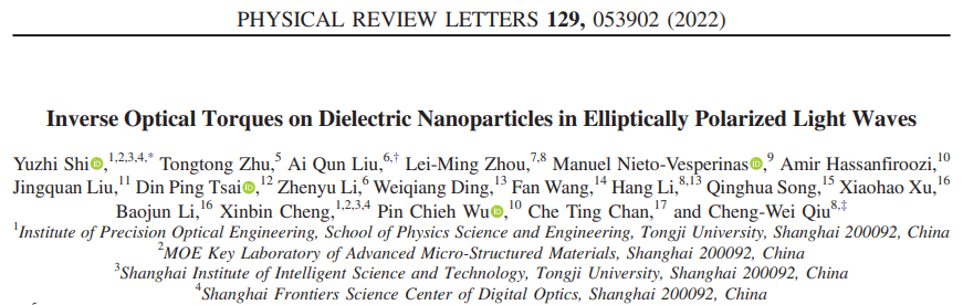 北京时间7月29日,同济大学物理科学与工程学院程鑫彬教授和施宇智特聘研究员团队在物理学权威期刊《物理评论快报》(Physical Review Letters)在线发表题为《椭圆偏振光作用下介电质纳米颗粒中的可逆光力矩》(Inverse Optical Torques on Dielectric Nanoparticles in Elliptically Polarized Light Waves)的论文。该论文首次研究了椭圆偏振光作用下非金属纳米颗粒中的可逆光力矩,揭示了不同偏振态在一定光学入射角的情况下对光力矩的作用机制。