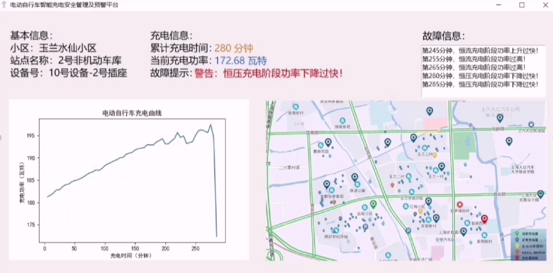 在此基础上,团队自主设计了“森创”电动自行车智能充电安全管理预警平台,实时显示社区充电桩插座运行情况和充电数据,并利用大数据构建充电功率曲线特征算法模型,对问题电动车和故障充电器及时排查预警,为现实问题提供思考与方案。