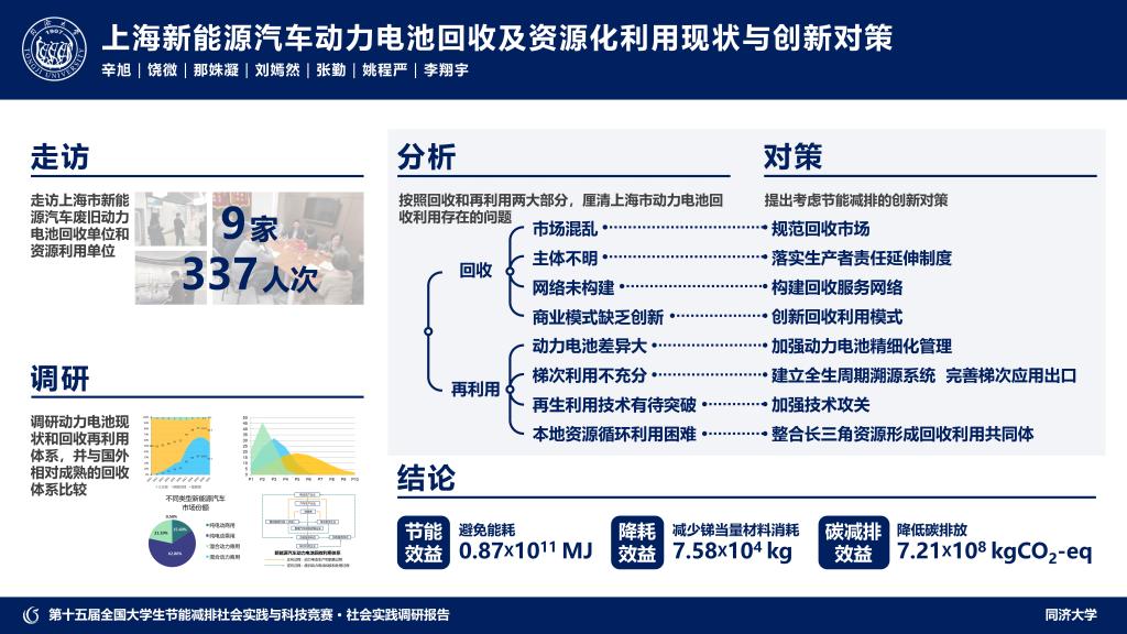 上海新能源汽车总规模位居全国第一、全球前列。根据动力电池的寿命分布,首批投入市场的新能源汽车动力电池已处于淘汰临界点并进入规模化退役阶段。在上海严格减排目标的约束下,充分挖掘电池材料的回收经济价值势在必行。由经济与管理学院4名博士研究生、2名硕士研究生和设计创意学院1名本科生组成的团队,对上海市新能源汽车、动力电池及其回收情况开展调研,发现电池回收利用面临技术瓶颈、支撑体系不健全、商业模式创新匮乏等问题。对此,团队针对性地提出了相应建议:斩断非法回收渠道,实现回收信息溯源;政府管控回收市场价格;加快构建电池回收服务网络;完善新能源汽车动力电池全生命周期溯源管理系统;加强再生利用技术攻关等。“我们希望这些建言能为发展新能源汽车产业和循环经济、落实我国“双碳”目标提供决策参考。”辛旭说。