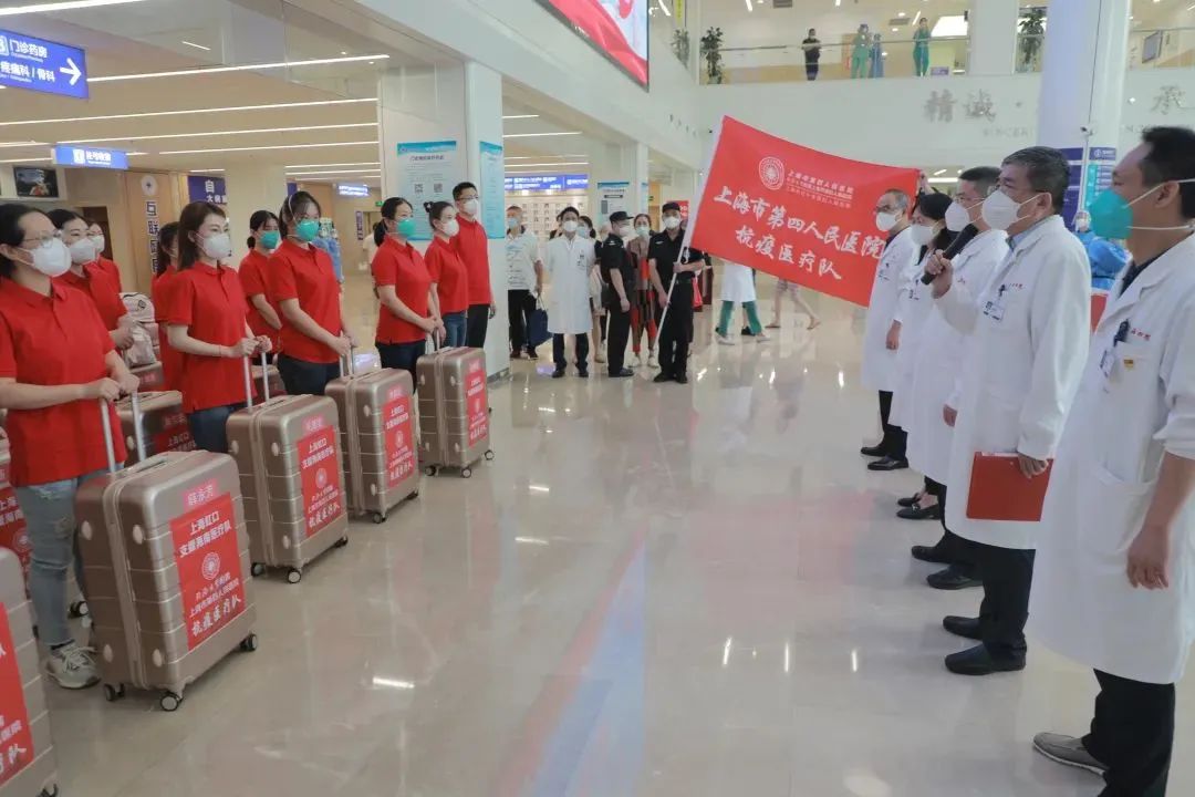 8月12日,附属上海市第四人民医院援琼医疗队出征。援琼医疗队领队、临时党支部书记、副院长李晓光,医疗队长、总护士长盛夏带领一支由50名护理人员组成的队伍,紧急驰援海南抗疫一线。