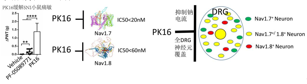 基于这一新发现,团队进一步筛选到能显著缓解坐骨神经选择性切断小鼠和糖尿病小鼠的神经痛的小分子化合物PK16。PK16具有很好的安全性和无镇静副作用,有望成为更佳的外周神经痛止痛药和广谱镇痛药物,帮助大量慢性疼痛病人重回“无痛”的生活。该项目已申请国内和PCT专利。