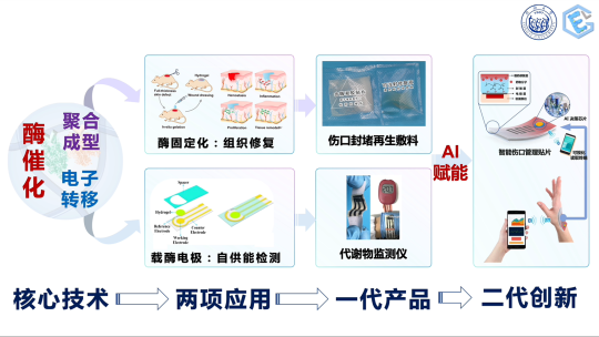 同济大学化学科学与工程学院王启刚团队针对解决运动的大的创伤和糖尿病足这些难愈合创伤,设计了一类智能创伤修复材料。第一代产品主要特征是物理封堵、生化逆转和再生修复等多重功能的高效整合。未来第二代产品,预期利用伤口即是“窗口”概念,利用生物催化传感的技术,对病变微环境中一些代谢指标的变化进行监测,实时了解创口的修复状态,进行AI计算后,实现相关药物或者促修复因子的可控释放,最后实现未来智能化的伤口封堵和高效的修复。
