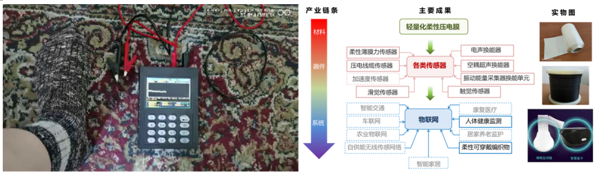 同济大学物理科学与工程学院张晓青团队针对物联网领域对柔性敏感材料和传感器的巨大需求,研发完成轻量化柔性压电功能膜的制备技术和性能调控方法,开发了一系列基于该功能膜的传感器(包括柔性薄膜触觉传感器、可穿戴智能织物传感器、空耦超声波换能器、压电线缆传感器等)。项目研发的柔性压电功能膜制备技术、压电线缆和压电纤维制备技术均达到小规模生产水平,其性能指标皆优于国外企业的垄断产品。此成果已形成包括功能材料、传感器和执行器以及智能感知系统在内的完整产业链条。