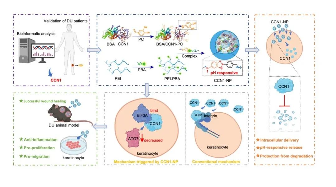 基于生物信息学分析与临床样本验证,李斌课题组发现糖尿病溃疡患者皮损中CCN1处于差异基因的核心节点且表达降低,提示了外源性CCN1蛋白的愈创潜能。由于CCN1蛋白在富含蛋白酶的糖尿病创面环境下易降解,课题组制备了CCN1的纳米制剂:应用与CCN1通过化学键结合的苯硼酸/原儿茶醛(PBA/PC)及具有静电相互作用的聚乙烯亚胺(PEI)两个模块构成,在提升CCN1稳定性的同时,促进了蛋白的细胞内递送。与传统CCN1作为细胞外基质蛋白结合整合素受体发挥效应途径不同,基于纳米递送的胞内CCN1展示了更优的抗炎与促增殖/迁移活性,机理上胞内CCN1与EIF3A互作,并下调ATG7表达。体内/外实验证实,CCN1纳米制剂有效促进糖尿病溃疡动物模型上皮化愈合,改善炎症指标,促进细胞增殖/迁移,且优于阳性对照药物rb-bFGF/bFGF,为慢性皮肤溃疡提供了一种有前景的新治疗策略。