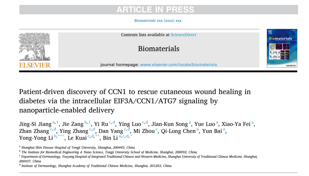近日,同济大学附属皮肤病医院院长李斌教授团队以“Patient-driven discovery of CCN1 to rescue cutaneous wound healing in diabetes via the intracellular EIF3A/CCN1/ATG7 signaling by nanoparticle-enabled delivery”为题,在生物医学领域权威期刊Biomaterials(中科院一区)发表论文。