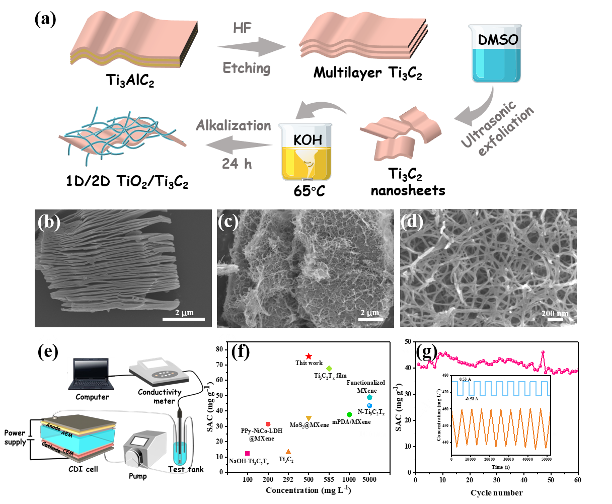 为此,该论文提出利用原位碱处理构建部分衍生的MXene脱盐电极(1D/2D TiO2/Ti3C2)的新策略,将其作为赝电容电极,实现了Na+的高效去除。这种材料具有以下优点:1)分级异质结构为盐离子的扩散和吸附提供了大量活性位点和丰富的孔隙;2)表面衍生1D TiO2 纳米线避免了内部2D MXene纳米片的堆叠,同时作为保护层缓解MXene的氧化,提升了电极材料脱盐的循环稳定性;3)TiO2-Ti3C2异质结促进了电吸附位点的电子转移,提升了盐离子的电吸附容量。