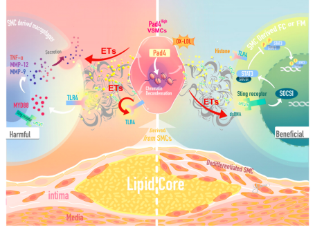 12月6日,同济大学附属第十人民医院彭文辉教授团队在《自然·通讯》(Nature Communications)在线发表了题为“Extracellular traps from activated vascular smooth muscle cells drive the progression of atherosclerosis”的研究论文。该研究首次揭示了在动脉粥样硬化斑块进展过程中,血管平滑肌细胞发生巨噬细胞转分化伴随PAD4表达升高,发生细胞外捕捉这一生物学现象。细胞外捕捉释放的DNA等物质,通过激活斑块中其他细胞的TLR4信号通路和STING-SOCS1信号通路,加速血管平滑肌细胞向致病性转分化,促进斑块进展和不稳定。该研究结论为动脉粥样硬化中血管平滑肌细胞命运重编程后相关功能研究填补了空白,为精准化靶向干预血管平滑肌细胞转分化方向从而治疗动脉粥样硬化疾病提供了理论依据。