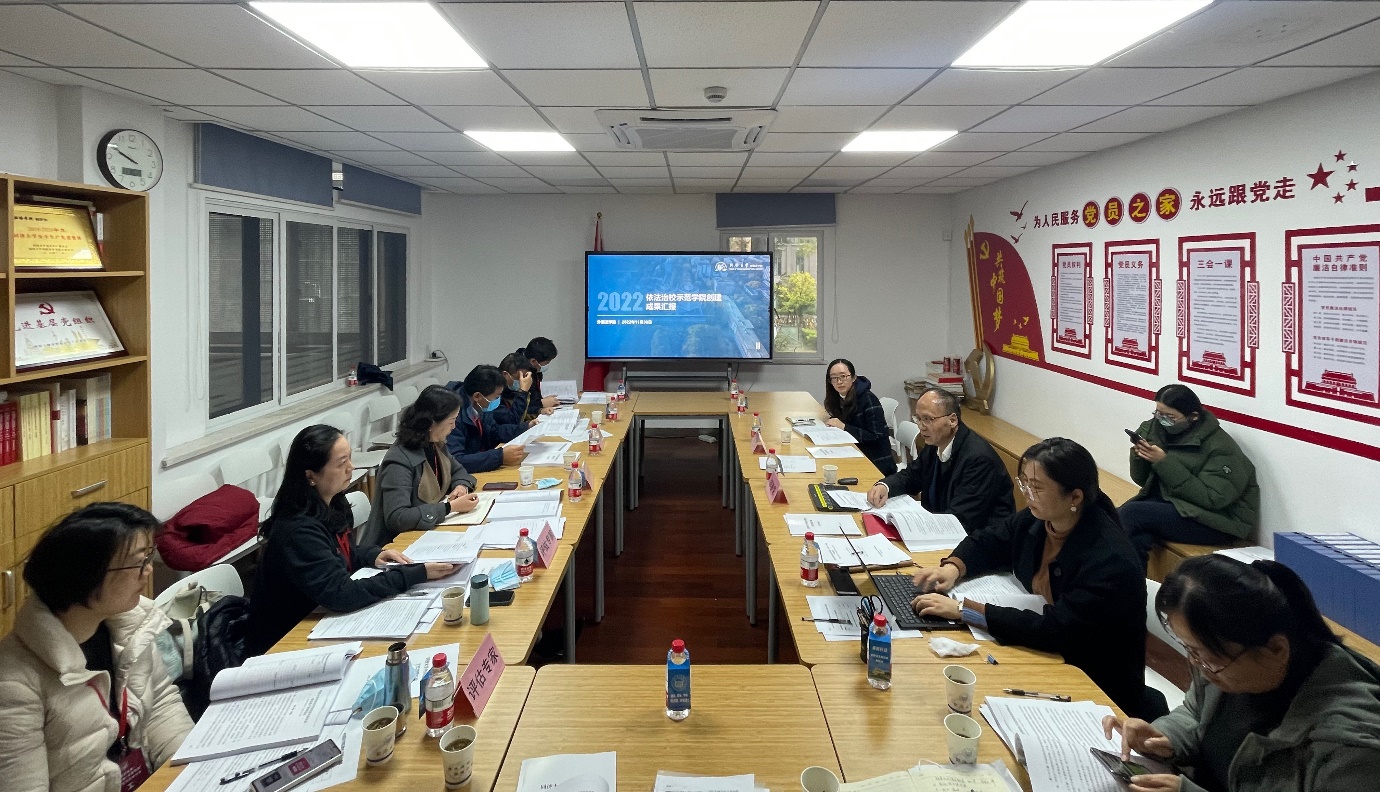 评估专家组分别与学院负责人、教职工代表和学生代表进行访谈,听取学院对学校法治工作的意见,就学院规范化建设工作中的不足提出建议,审查评选支撑材料并进行综合评议。
