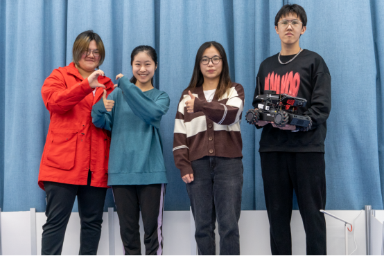 其中,参加竞技格斗类赛项的4支队伍由电子与信息工程学院创新基地智能车竞赛实验室选拔,张志明和余有灵两位老师指导,老队员罗翊杰、姚宇阳、金屹阳、杨怡、岳可、王聪聪等学生参与辅助管理。由刘欣(计算机科学与技术)、雷馨怡(通信工程)、杨宸哲(自动化)、李悦婷(车辆工程/汽车)组成的“智信•滴滴抓人队”参加了开放部件组机器人视觉对抗B组比赛;由张铭锐(大数据与数据安全)、张旭晖(自动化)、张飞扬(车辆工程/汽车)、段瑞源(软件工程/软件)组成的“智信•锐晖扬源队”参加了仿人体感格斗组比赛;由高远霆(自动化)、周庚栋(自动化)、杨思远(自动化)组成的“智信•汪汪队”和由龚哲飞(计算机科学与技术)、王晨曦(微电子科学与工程)、刘济(自动化)组成的“智信•针锋相队”参加了机器人视觉对抗A组比赛。