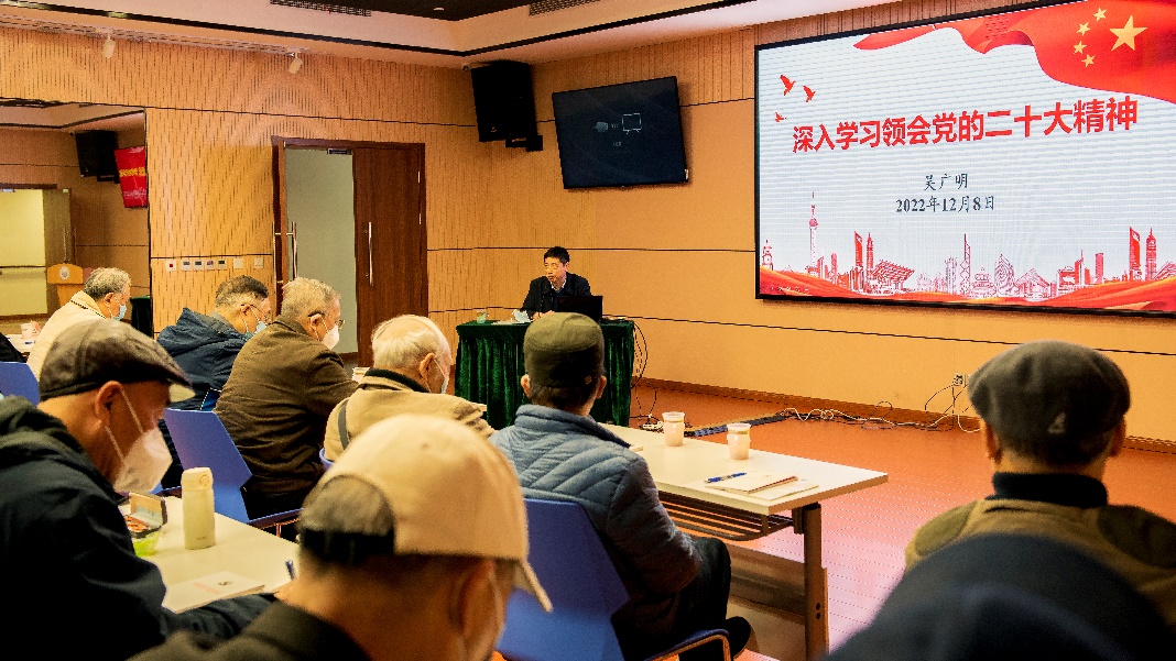 吴广明从党的二十大召开的背景意义及主题成果、过去5年的工作和新时代10年的伟大变革、马克思主义中国化时代化、中国式现代化、全面建设社会主义现代化国家的任务目标、坚持党的全面领导和全面从严治党、应对风险挑战七个方面解读了二十大报告的思想精髓和核心要义,并要求离退休干部按照“五个牢牢把握”和“九个深刻领会”要求,学深悟透党的二十大精神。