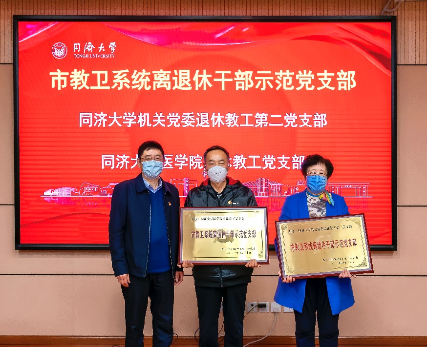 会上还举行了离退休干部示范党支部授牌仪式。吴广明分别为2022年度上海市离退休干部示范党支部和市教卫系统离退休干部示范党支部颁授了奖牌。在上海市委老干部局开展的首批离退休干部示范党支部创建中,我校土木工程学院地下系退休教工党支部、机关党委退休教工第二党支部获得“上海市离退休干部示范党支部”称号,医学院退休教工党支部获得“上海市教卫系统离退休干部示范党支部”称号。