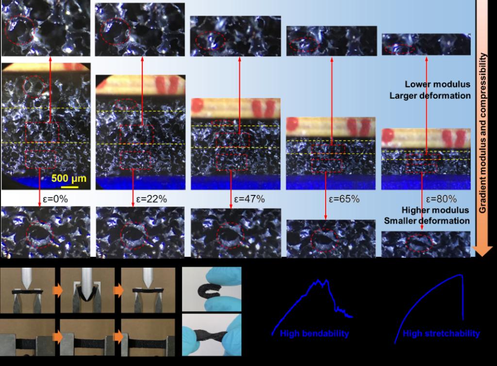 鉴于此,材料科学与工程学院祖国庆课题组采用溶胶-凝胶/热压/冷冻铸造/常压干燥的新策略,构建了具有梯度模量多孔结构的可拉伸、超弹性还原氧化石墨烯(rGO)/聚氨酯(PU)纳米复合气凝胶(图1),实现了超宽响应范围柔性压敏电子器件。相关研究成果以“Bioinspired gradient stretchable aerogels for ultrabroad-range-response pressure-sensitive wearable electronics and high-efficient separators”为题发表在Angewandte Chemie International Edition(《德国应用化学》)上,并被选为VIP论文。