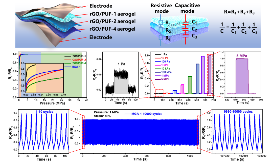 随着电子皮肤、健康管理、极端压力监测等需求的不断增长,宽响应范围柔性压敏电子器件的研发日益迫切。近年来,柔性气凝胶基压敏电子器件由于轻质和优良传感性能而备受关注。然而,气凝胶的可拉伸性和弹性通常较差,且目前柔性压敏电子器件检测范围通常较窄,难以满足宽范围压力传感的实际需求。宽响应范围高性能柔性压敏电子器件的构建充满挑战。