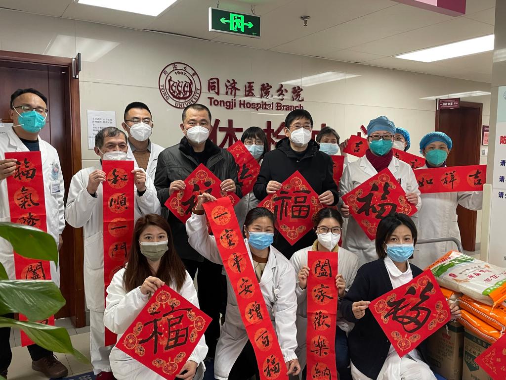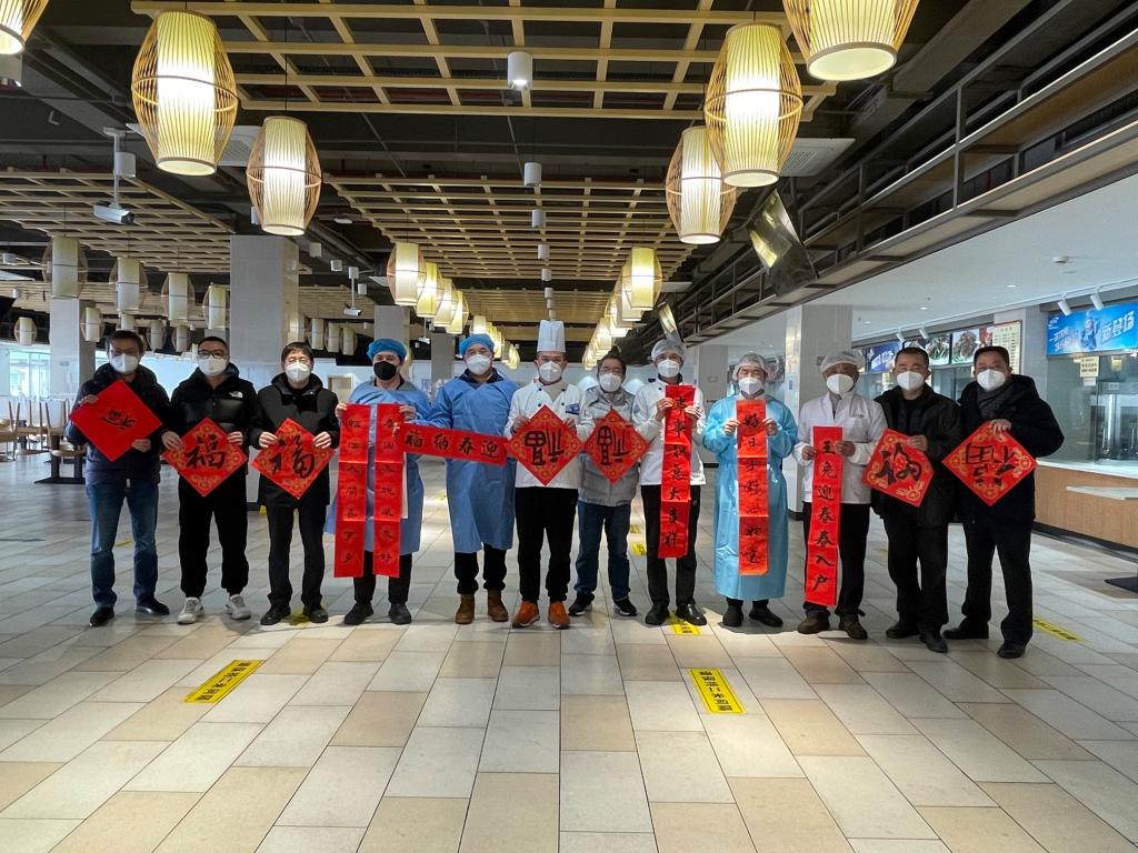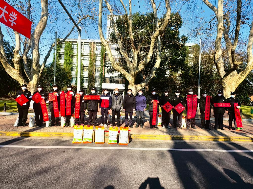 校工会一行带去了大米、面粉等慰问品和同济大学教工中国书画协会专家们手写的“福”字、春联,感谢他们一直以来为学校防疫工作的辛勤付出,并提前送上新春祝福。