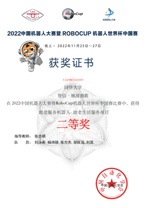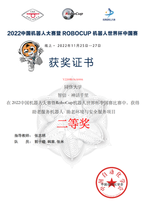 助老服务机器人比赛分为助老生活服务和助老环境与安全服务两个不同组别,主要考察机器人的人机交互能力、机械设计能力、SLAM以及自主导航能力、机械臂自主操作能力、语音定位功能、环境状态监测等任务的完成。由张志明老师指导的两支队伍顺利完成总决赛,并最终双双获得全国二等奖。其中,智信·雁浦渔歌队参加助老生活服务项目(第五名),队员为刘泳希(通信工程)、杨鸿银(电子信息工程)、张方杰(自动化)、邬致远(人工智能)、刘昊(控制科学与工程);智信·神话千里队参加助老环境与安全服务项目(第六名),队员为郭子瞻(自动化)、韩意(自动化)、张米(电气工程)。