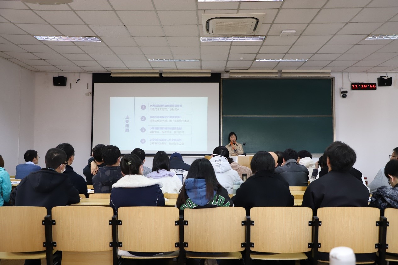 徐祖信院士带领同学们回顾了我国过去二十年的水环境治理历程,强调了“两山”理论等习近平生态文明思想在水环境领域的科学内涵,通过讲述治理苏州河十余年的亲身经历,深刻阐述了人与水资源、人与环境的紧密关系。她从黑臭水体治理初见成效、长江保护修复顺利推进、饮用水源保护持续发力、美丽乡村建设有序推进、工业水污染防治力度进一步加大、地下水和航运污染防治开始起步、生态环境管理能力不断提升、环境执法能力不断提升以及环境执法力度不断加大八大重要成效入手,为大家介绍了中国水污染防治取得的举世瞩目的历史性成就。