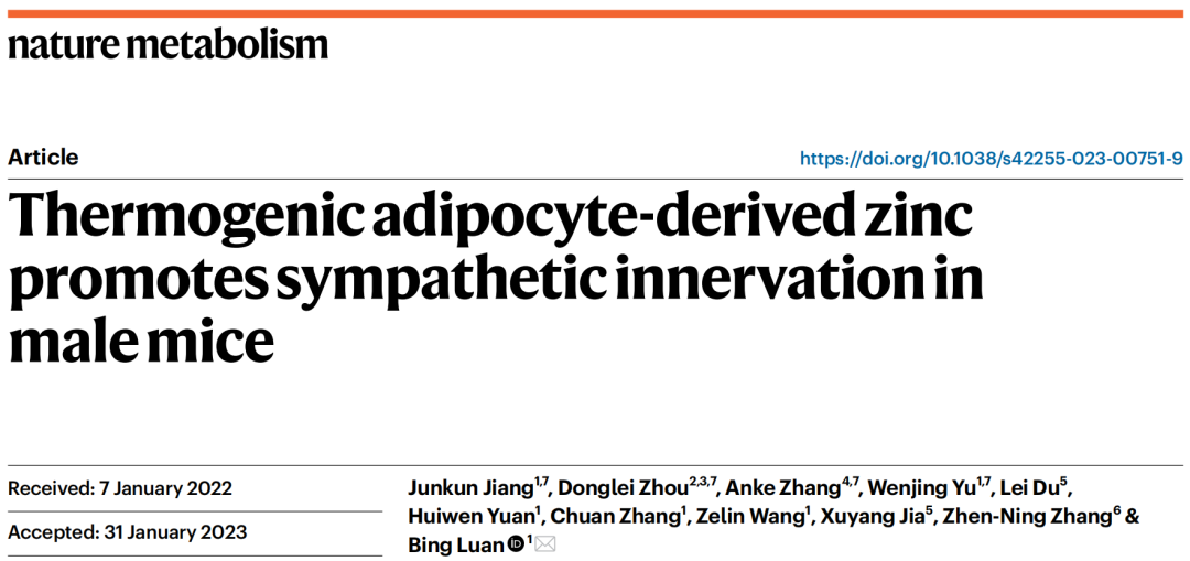 3月6日,同济大学医学院、附属同济医院栾冰教授团队在《自然·代谢》(Nature Metabolism)杂志上发表题为“Thermogenic adipocyte-derived Zinc promotes sympathetic innervation in male mice”的研究成果。该研究报道了产热脂肪细胞可分泌锌离子作为脂肪因子激活交感神经的活性,进一步促进脂肪组织的适应性产热,为肥胖的治疗提供了新的理论基础。