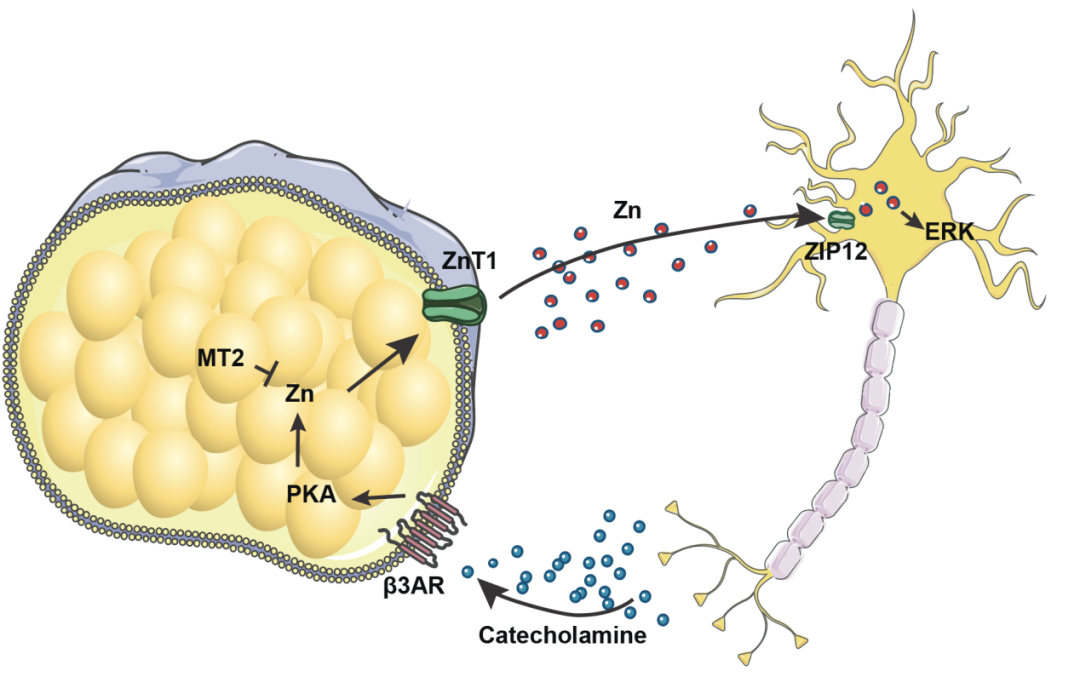 总之,该研究发现锌离子作为产热脂肪细胞分泌因子,可增强小鼠脂肪组织中交感神经投射以及产热。同时研究也详细阐明了脂肪细胞在GPCR信号刺激下通过细胞膜上的离子通道ZnT1释放Zn离子的机制,以及Zn离子通过交感神经细胞上的ZIP12激活ERK信号通路从而促进交感神经突触生长的机制。更为重要的是研究人员揭示了脂肪细胞中重要锌离子调控蛋白金属硫蛋白(Metallothionein 2,MT2)在肥胖发生中的重要作用,而这一作用依赖于其对Zn离子释放和交感投射的影响。因此,该研究确定了产热脂肪细胞和交感神经元相互调节的正反馈机制。这种机制对于适应性产热很重要,可以作为治疗肥胖的潜在靶标。