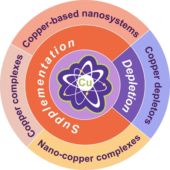 目前相关的研究主要集中在供应铜方向,铜基纳米材料、铜配合物和纳米铜配合物均被用于肿瘤治疗的研究。考虑到铜供应试剂种类繁多,功能也各有不同,文章对不同类型的铜供应试剂进行了更加详细的分类与总结。随着纳米科技的发展,铜基纳米药物在肿瘤治疗领域引起了广泛的重视,不仅可以作为优良的药物载体,还能够通过自身直接产生治疗效果。鉴于顺铂在肿瘤治疗中的巨大成功,铜配合物也被广泛研究用作可能的替代选择。此外,纳米铜配合物也是重要的铜供应试剂。将纳米材料与铜配合物整合为同一体系,既保留了治疗效果, 又解决了铜配合物本身高全身毒性、高疏水性能和低生物利用度的问题,为肿瘤治疗提供了另一个角度和思路。
