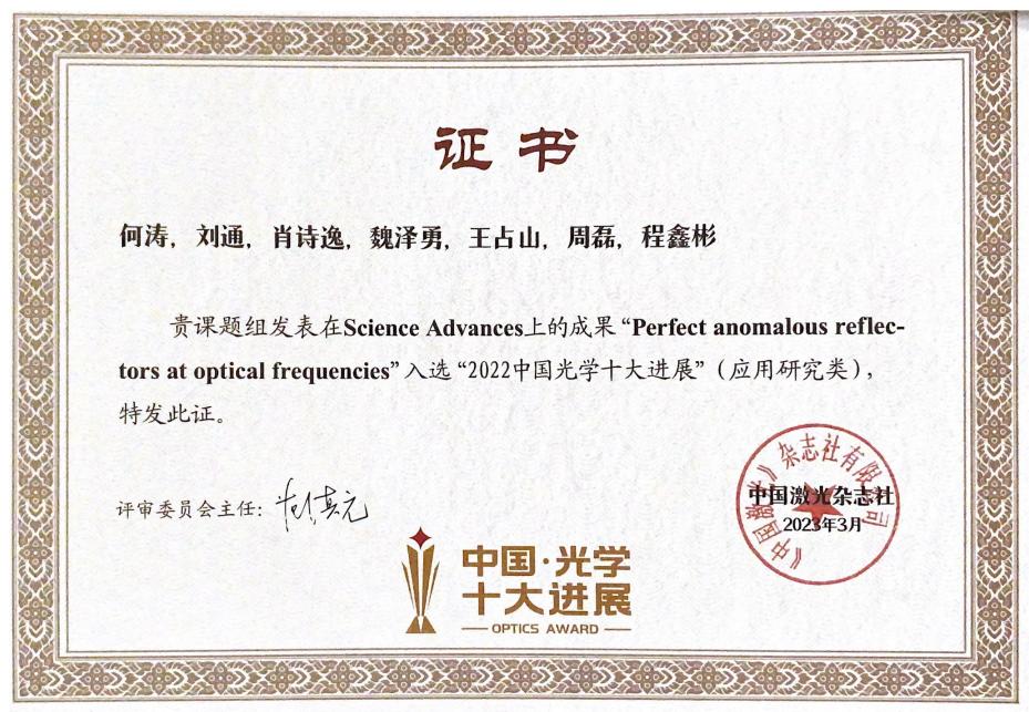 同济大学科研成果“光频完美异常反射器”入选“2022中国光学十大进展”