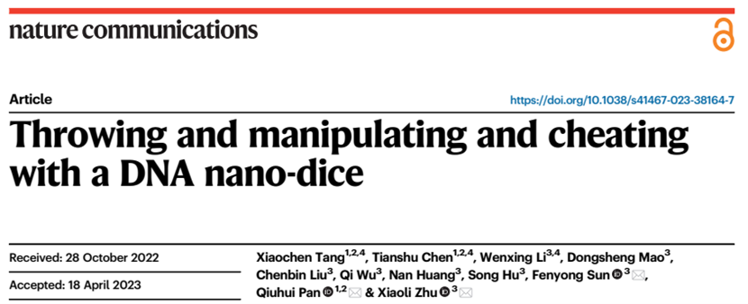 4月28日,孙奋勇、朱小立团队联合上海交通大学医学院附属上海儿童医学中心潘秋辉团队在Nature Communications杂志在线发表了题为“Throwing and manipulating and cheating with a DNA nano-dice”的研究论文。该研究基于立方体结构的DNA框架和氧化石墨烯的特殊性能,构建人工纳米骰子系统,为DNA技术在分子计算模拟提供了新的模型。