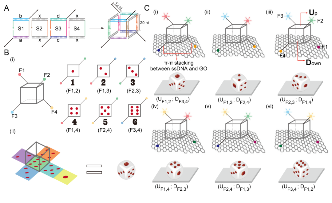 骰子投掷,作为一种随机模型,可以通过改变条件来表示不同概率的事件,以执行某些逻辑运算,但在分子尺度上实现这一过程还从未报道。该研究根据DNA立方体结构(骰子)在氧化石墨烯(投掷台)上呈现的荧光信号进行骰子计数,从而模拟骰子投掷过程中不同点数的可能性,并进一步使用熵驱动的链置换反应定向操纵骰子完成点数的人工翻转,或改变骰子微结构引起点数概率的不等事件从而实现“作弊”。研究团队所开发的可控DNA纳米骰子未来有望应用于智能分子器件,在微观尺度执行复杂的任务,如逻辑电路或色彩编码,从而为疾病的智能分子诊断等应用奠定底层基础。