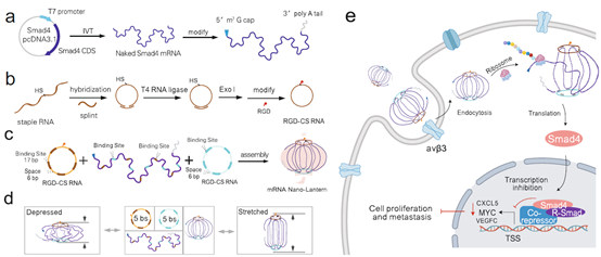 mRNA递送在治疗各种疾病中显示出很高的应用价值,但其有效递送仍是目前的一大挑战。核酸折纸术可以将单链核酸分子折叠压缩至纳米级别,使其具有较线性DNA分子更稳定的理化性质。基于此,研究人员提出了一种用于mRNA递送的灯笼状柔性核酸折纸技术。该核酸折纸由一个靶标mRNA作为支架和两个RGD修饰的环状Staple RNA组成,它们可以将mRNA压缩到纳米级,并促进其被细胞内吞。同时,与经典的核酸折纸不同,该柔性核酸折纸结构保留mRNA的大部分活性区域,从而确保其翻译效率。细胞与动物水平的实验结果显示该策略实现了Smad4 mRNA的结直肠癌细胞靶向递送和胞内Smad4蛋白翻译表达,从而对结直肠癌的生长进程进行有效抑制。该策略为mRNA的精准靶向递送提供了新的方案,也为基于mRNA的结直肠癌治疗提供了新的思路。