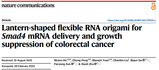 3月10日,孙奋勇、朱小立团队联合附属同济医院葛步军教授团队在Nature Communications杂志在线发表了题为“Lantern-shaped flexible RNA origami for Smad4 mRNA delivery and growth suppression of colorectal cancer”的研究论文。该研究提出了一种基于柔性核酸折纸技术的mRNA递送新方案。在该方案中,Smad4 mRNA既是核酸药物,也是核酸折纸的骨架,实现了Smad4 mRNA的结直肠癌细胞靶向递送,并显著抑制了结直肠癌的生长进程。