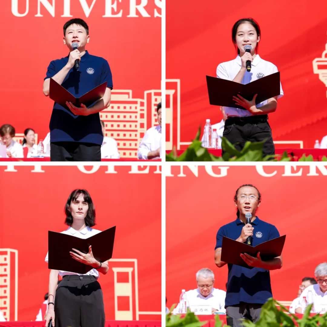 “新的起点,新的征程,引领创新发展之路,我同济人勇担使命!实现中华民族伟大复兴之梦,我同济人义不容辞!让这艘青春之船启航!”材料科学与工程学院2020级博士研究生、同济大学2023年追求卓越学生奖获得者王腾锐,国豪书院医学试验班2023级本科生董伊凡,土木工程学院2023级博士研究生、第31届世界大学生夏季运动会男子复合弓团体金牌获得者杜美余,来自法国的国际文化交流学院2023级硕士研究生安蕊,作为学生代表发言、共同朗诵,结合各自的求学成长成才经历,对新时代同济文化的内涵作了生动演绎和诠释,表达了同济学子矢志奋斗、报国强国的信心和决心。慷慨激昂的语调、饱满真挚的情感、踔厉奋发的青春故事,赢得了热烈掌声。