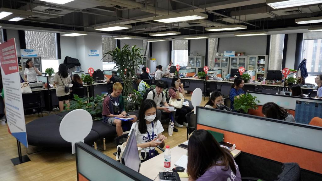 9月4日一大早,留学生办公室的老师和中外学生志愿者精心布置迎新场地,迎接即将加入同济大家庭的国际新生。阳光明媚的校园、宽敞明亮的教室、整齐码放的物资、热情专业的志愿者,一同静候新生的到来。随着迎新报到正式开始,留学生办公室的志愿者们身穿统一志愿衫,用热情的笑容、亲切的问候和贴心的服务欢迎来自世界各地的莘莘学子。