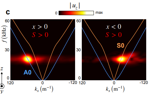 图中理论上A0和S0的色散曲线分别由蓝色和橙色实线标出。当源的振荡频率为20kHz时,我们测到了上图的结果:在源右侧(x>0)主要为A0模式,源左侧(x<0)主要为S0模式。通常来说,控制两个边界上振动的对称性,需要在每一条边界上都放置一个激励源。但是在兰姆波中,得益于其自旋角动量结构,可以通过A/S模式自旋分布性质的差异,仅在单独一条边界上激励特定的模式。