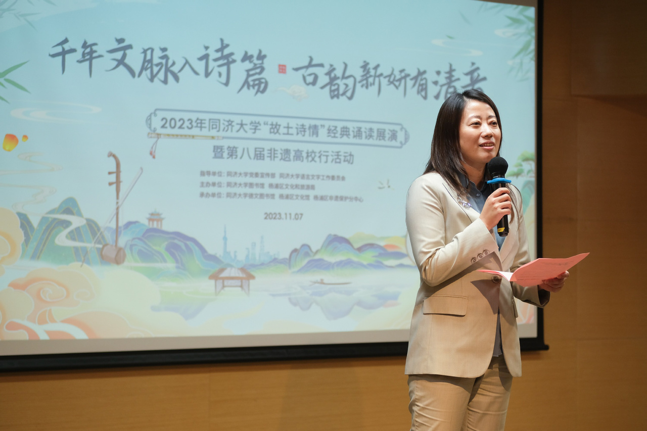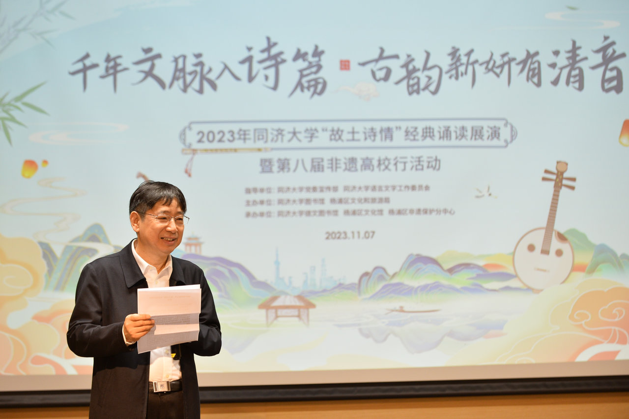 11月7日,2023年同济大学“故土诗情”经典诵读展演暨第八届非遗高校行活动在德文图书馆举行。校党委副书记吴广明,上海市杨浦区委宣传部副部长、区文化旅游局党组书记、局长胡琳,国家一级演员、上海电影演员剧团著名表演艺术家赵静,以及相关职能部门和学院负责人出席活动。