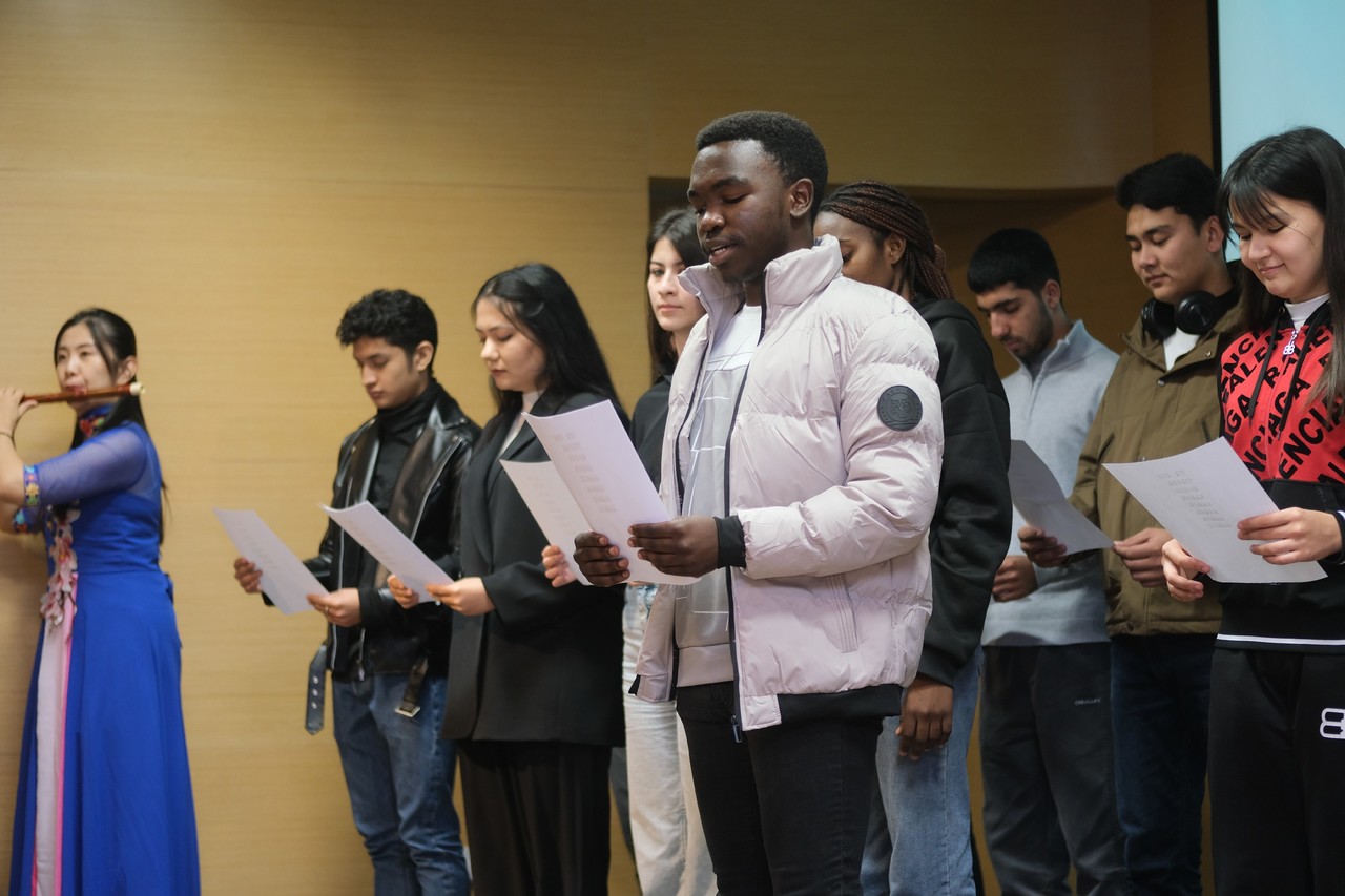 随后,20位国际文化与交流学院国际学生代表在非遗项目丝竹配乐下,为现场观众带来古诗《江南》。国际学生们用稍显生涩的普通话,认真专注地诵读着“江南可采莲,莲叶何田田。鱼戏莲叶间……”在回旋反复的音调中,感受中国古诗词的韵律之美,演绎极致中式浪漫。